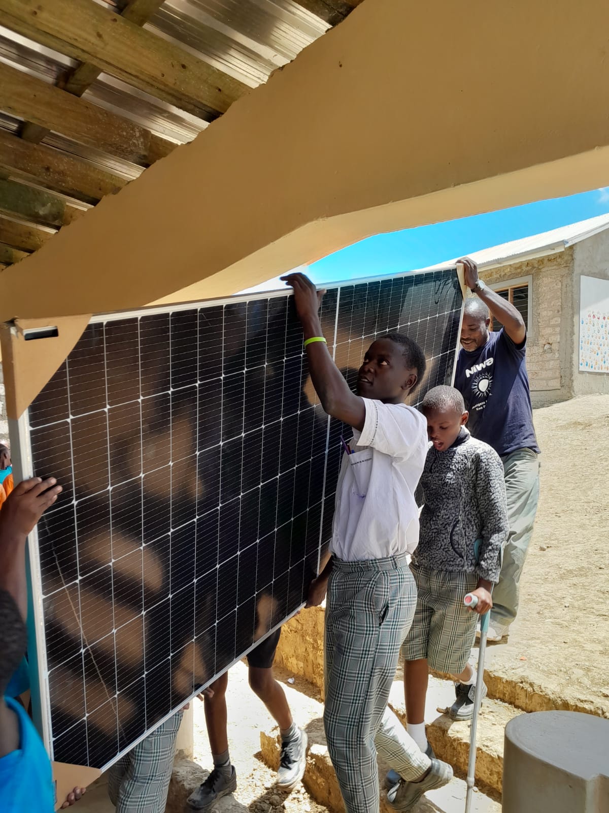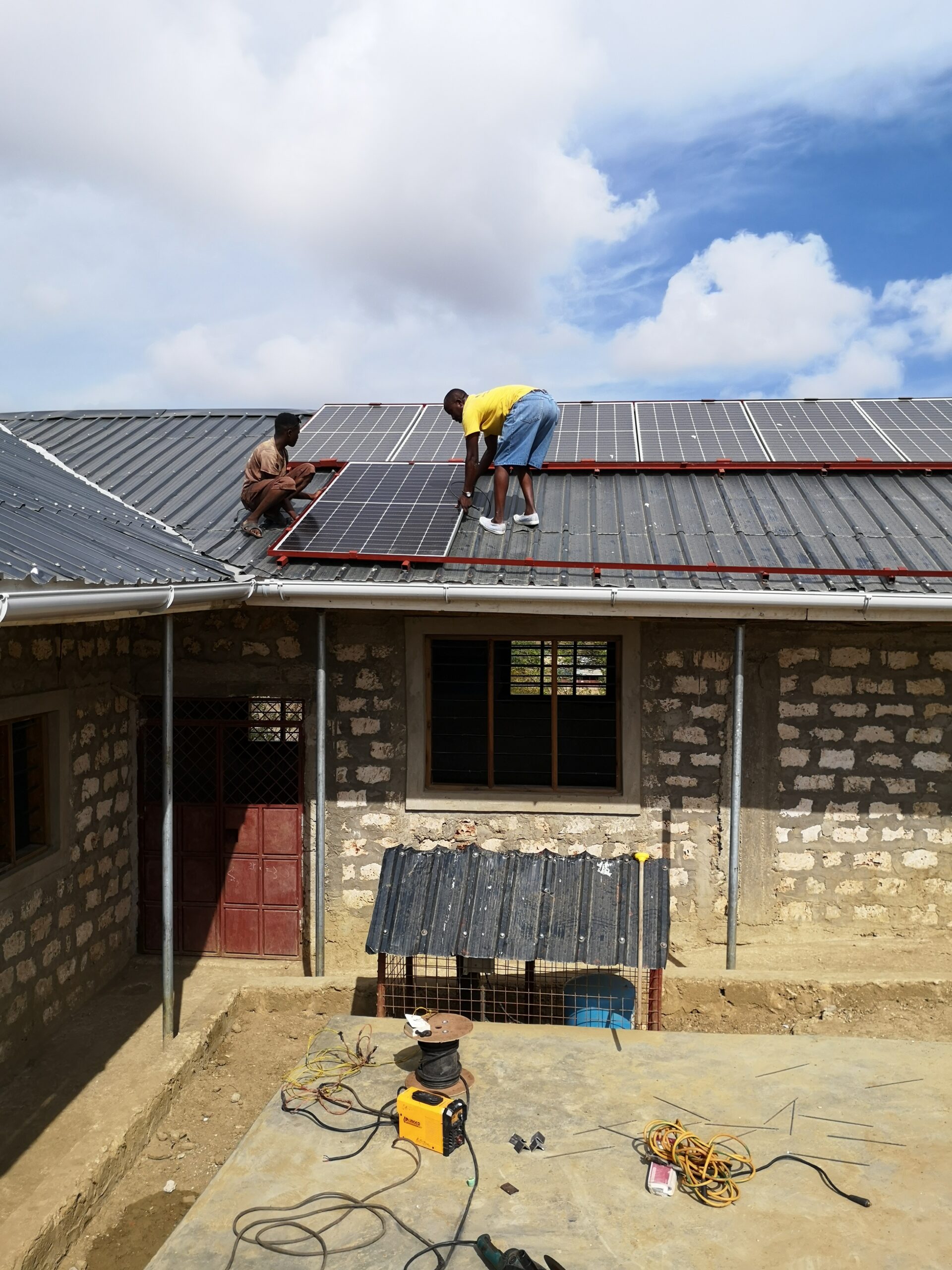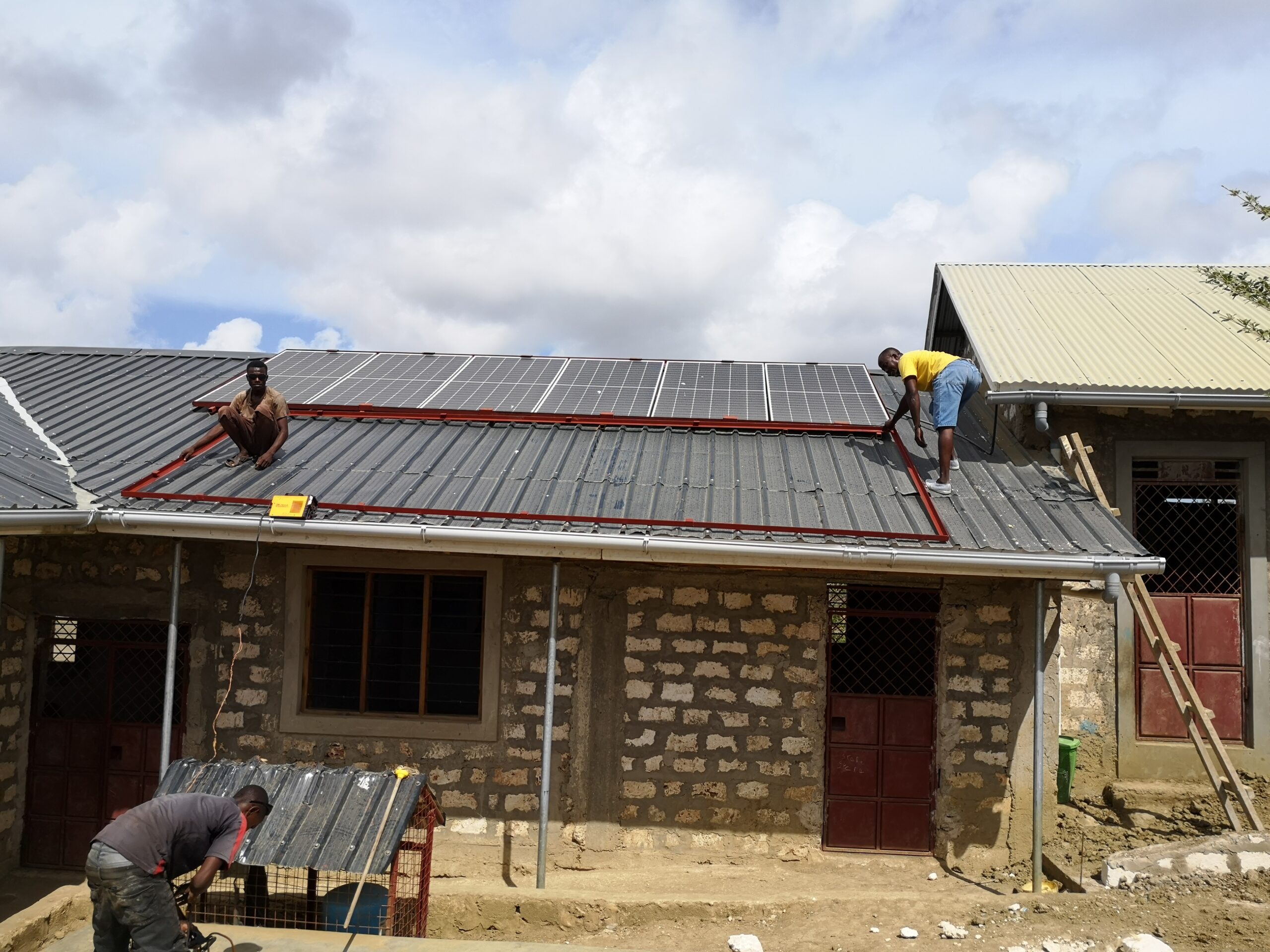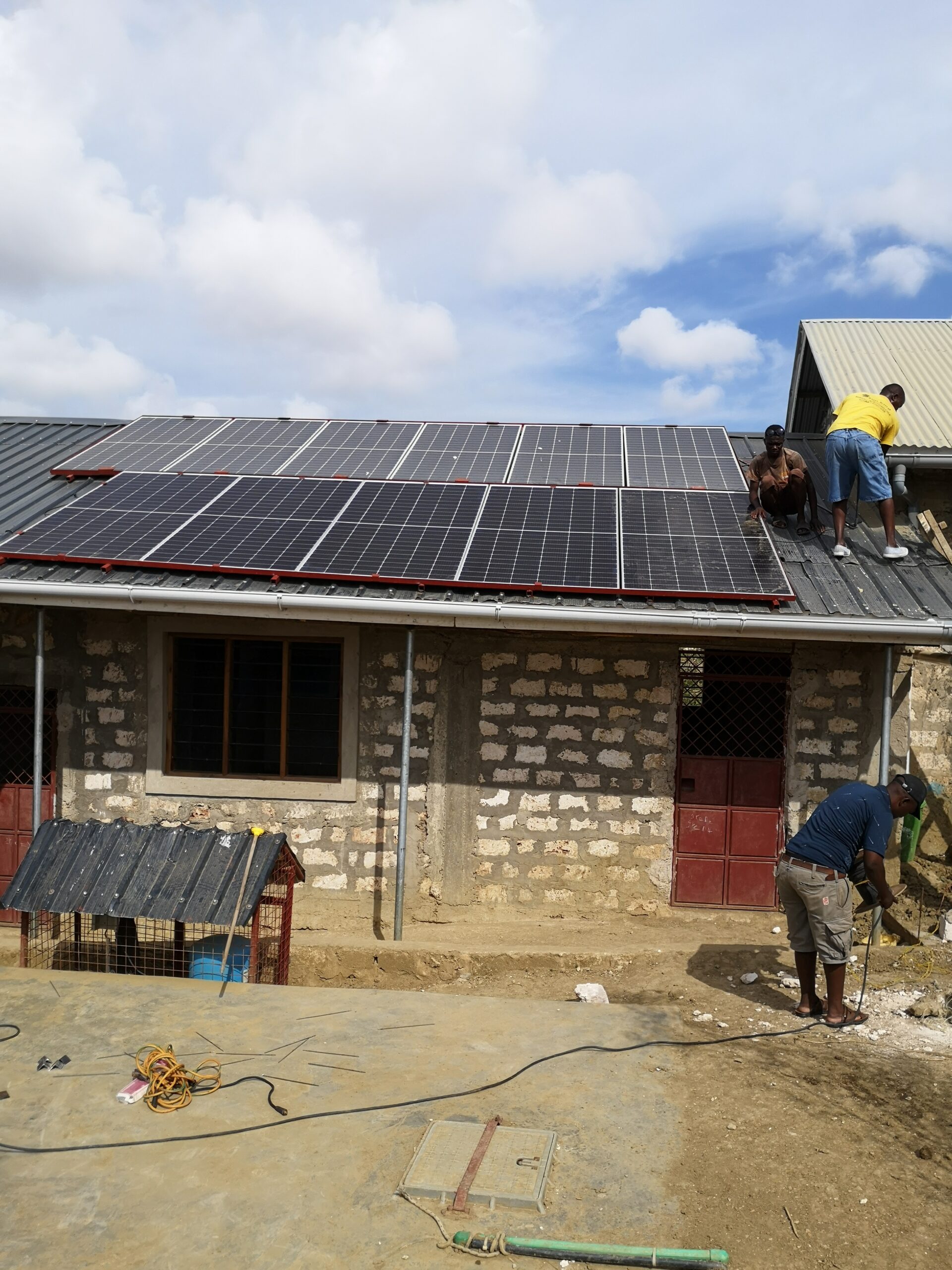 Mit der Inbetriebnahme der Küche wurde uns somit klar, dass die Energie unserer Solarpanels mit der Batterie nicht ausreichend ist. Komisch war jedoch, dass wir in der Nacht einen relativ hohen Stromverbrauch hatten und es jeweils vorkam, dass die Batterie am Morgen leer war. Dies führte dazu, dass wir mehrmals keinen Strom hatten, da zusätzlich die Sonne fehlte. So hatten wir keine Wasserversorgung und konnten kein Essen kochen. Wenn die Technologie aussteigt, müssen altbewährte Methoden wie Feuer und Wasserkurbel aushelfen. Es zeigte sich dann, dass die Sicherheitslichter in der Nacht mehr Strom verbrauchten als zuerst angenommen. Deshalb mussten wir einige entfernen. Alles in allem war aber klar, dass die Versorgung für den Küchenbetrieb nicht ausreichen würde. So nahmen wir erneut Kontakt mit unserer Solarfirma Greenlog auf. Wenige Tage später wurden uns bereits vier 550W Panels aus Nairobi geliefert, welche am darauffolgenden Tag erfolgreich installiert werden konnten. Von diesem Punkt an, war kochen kein Problem mehr. Stand jetzt bringen unsere Panels aber mehr Leistung als unser Inverter übertragen kann. Da der Strombedarf mit der Grösse der Schule in den nächsten Jahren zunehmen wird, werden wir als nächstes einen zusätzlichen Inverter und eine weitere Batterie brauchen. Fürs Erste sind wir aber gut aufgestellt und produzieren genügend Strom für den gesamten Schulbetrieb!